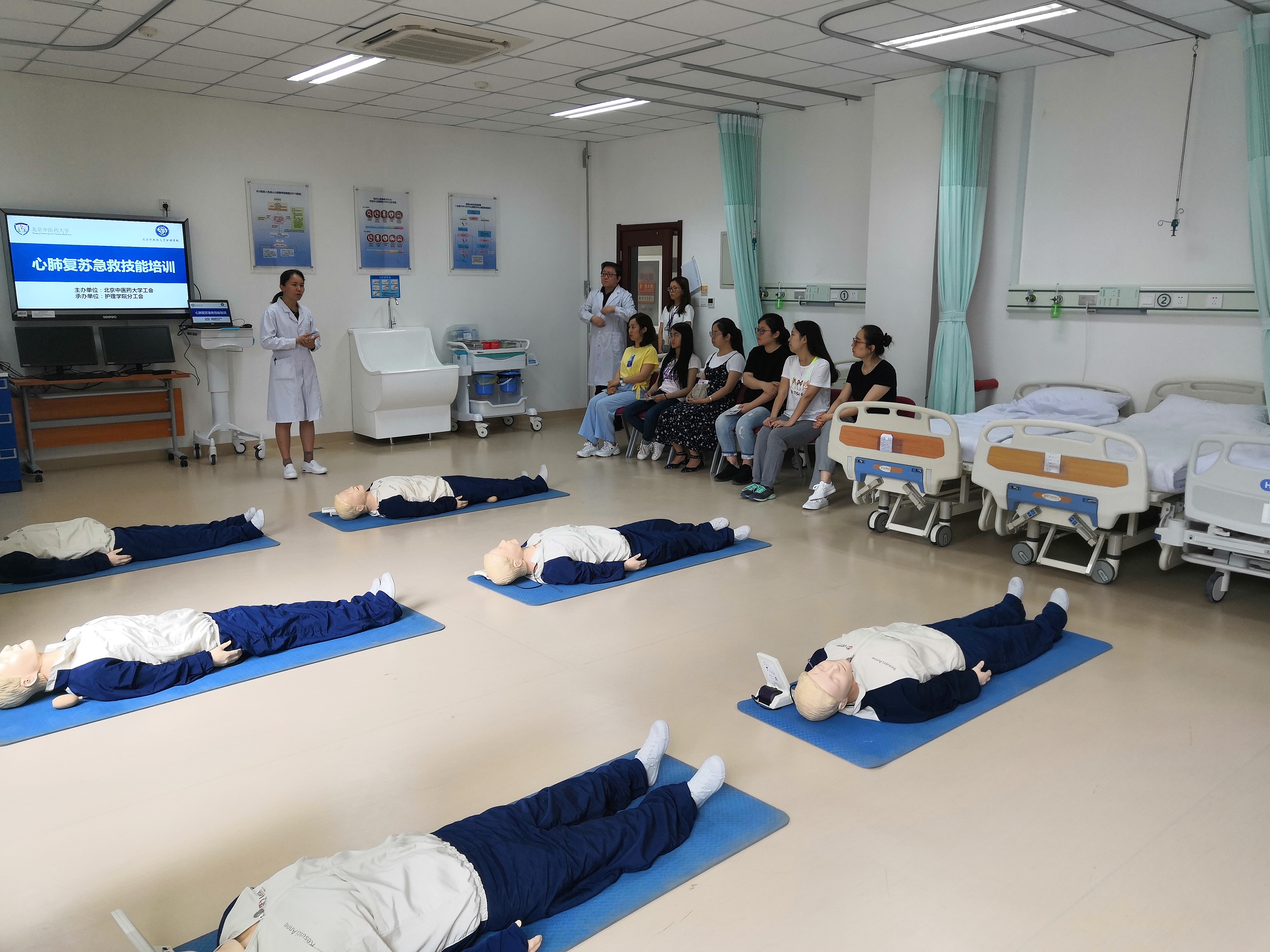为积极响应向全民普及应急救护知识和技能的政策,提高我校教职工院前急救能力和面对突发状况的应急处置能力,36365线路检测登录入口分工会于2019年6月5日举办了“拯救生命,从‘心’开始”心肺复苏急救技能培训,全校共56名教职工参加了本次培训。