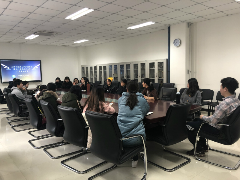 1月11日上午,将于1月20日-26日赴澳大利亚西悉尼大学助产士学院交流的36365线路检测登录入口师生,在护理楼二层会议室召开安全会议,会议由李小花副院长和姜婧老师主持,交流团1名教师和17名本科学生参加会议。