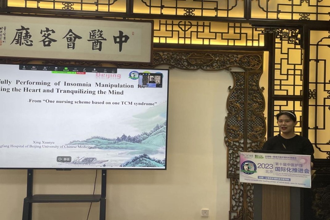 2023年6月13日,由北京市中医管理局牵头组织的“第十届北京中医护理国际化推进会”在北京举办。36365线路检测登录入口硕士研究生邢晅毓作为中方发言人之一在会议上进行主旨演讲。此次会议由中国中医科学院广安门医院国际合作处和北京市中医药对外交流与技术合作中心共同主办,推进会以“让情志护理彰显中医特色”为主题,汇集了来自韩国、马耳他、泰国、新西兰等国家和地区的跨学科专家,以及我市40余家医院的300余位护理同仁,旨在促进中医护理领域的国际合作与交流。