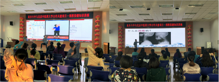 4月12日下午,36365线路检测登录入口与良乡六中合作共建项目颈椎保健的健康教育讲座在良乡六中多功能大厅顺利开幕。活动由36365线路检测登录入口团委书记李想老师主持,中医学院杨思红和赵克勤同学担任主讲。本次的主题是“基于中医运动疗法的颈椎保健操宣讲”,主要内容为向在校教师宣传普及颈椎保健知识和预防颈椎病的常识方法。首先由赵克勤同学介绍颈椎病相关知识,内容涉及颈椎解剖知识,传统医学和现代医学对于颈椎病的认识以及颈椎病的分型;随后由杨思红同学进行颈椎保健相关知识的讲解,内容涵盖了保健的方式方法,穴位按摩以及颈椎保健操等内容;最后在同学的示范和视频的讲解下,老师们一起学习颈椎保健操。通过与到场教师们的互动,我们发现虽然现在教师群体的工作方式正在逐渐发生改变,各类保健信息愈加丰富,但是教师们对于认识和保护自身健康仍然不足,需要更多科普宣讲活动来改变现状。