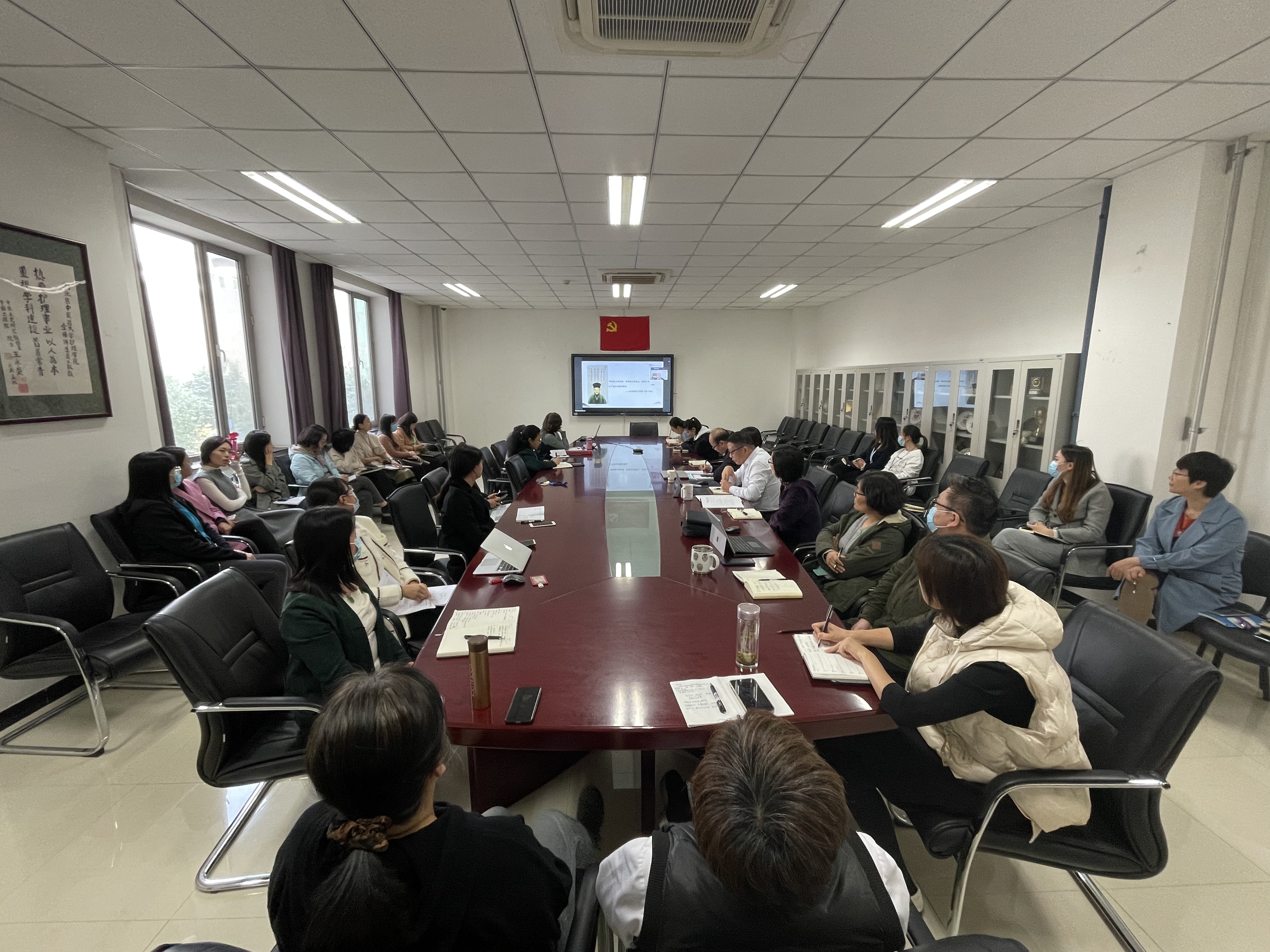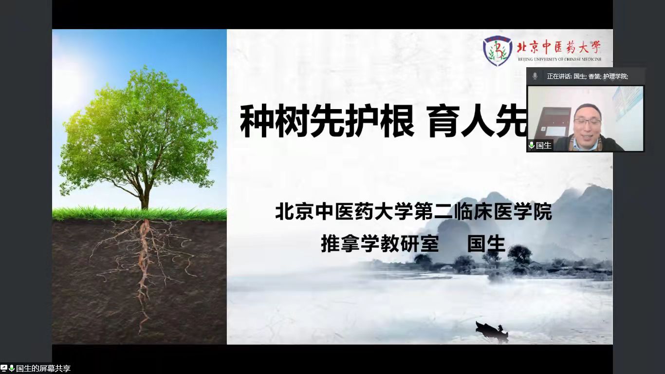 国生老师通过腾讯会议进行了主题为“种树先护根 育人先培心”的线上分享,国老师首先梳理了其所在科室推拿理疗科的历史沿革,从而引出从《医宗金鉴·正骨心法要旨》到“恒德、安人、敬技、致远”科室精神的传承脉络,国老师以医德医风为切入点,结合其导师付国兵教授的模范事迹,分享了自己对师德师风的理解和感悟。