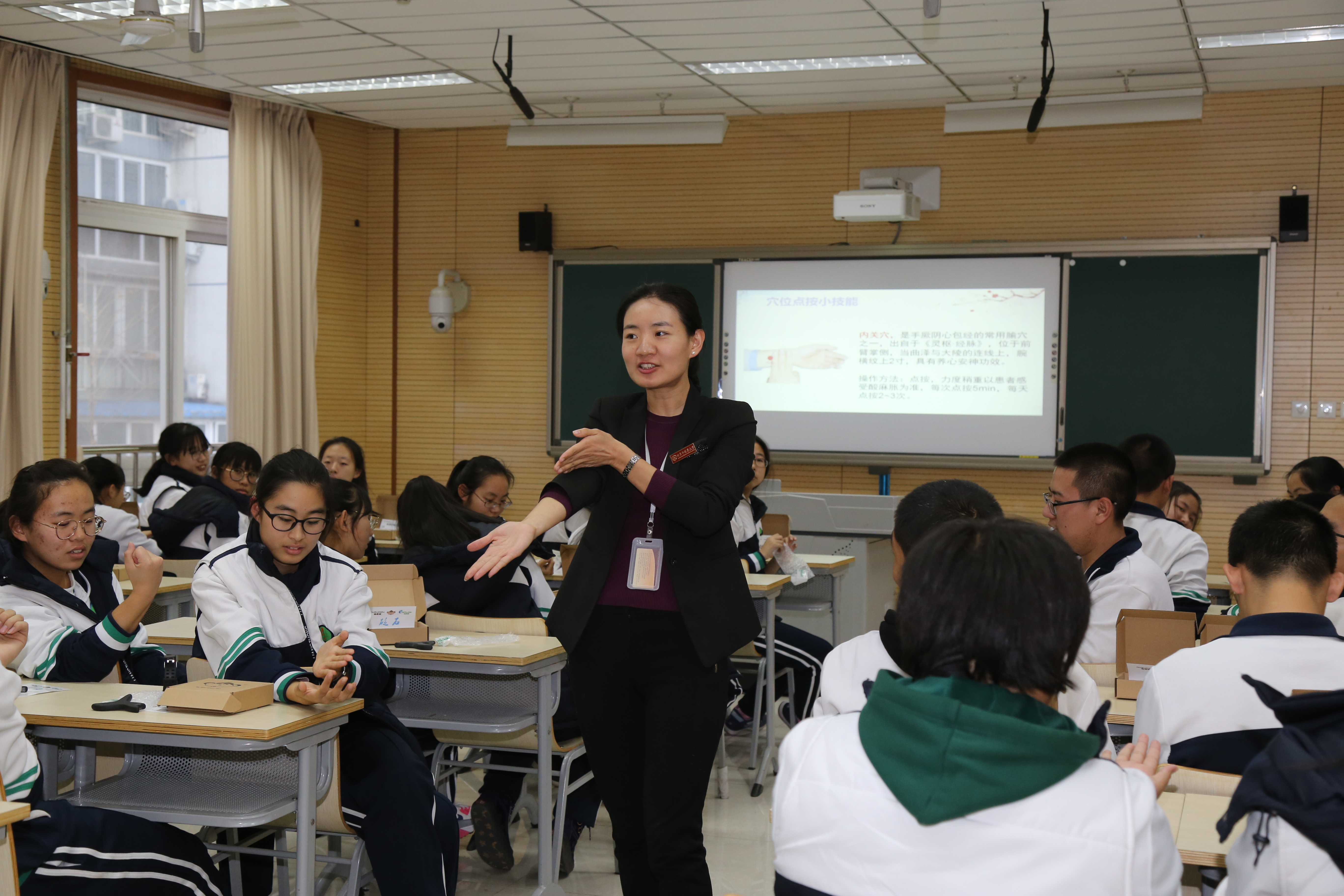 随后,为每个学生分发了一套砭石点穴保健器械,姜老师为大家详细的介绍了足三里、百会穴、四神聪、印堂穴、劳宫穴和内关穴等穴位的定位,同时教会大家如何运用中医穴位进行健脾养胃、醒神健脑、宁心安神等生活保健,并亲临学生的身边手把手教学生定位,询问学生点穴的感受。学生们纷纷表示中医保健的博大精深。