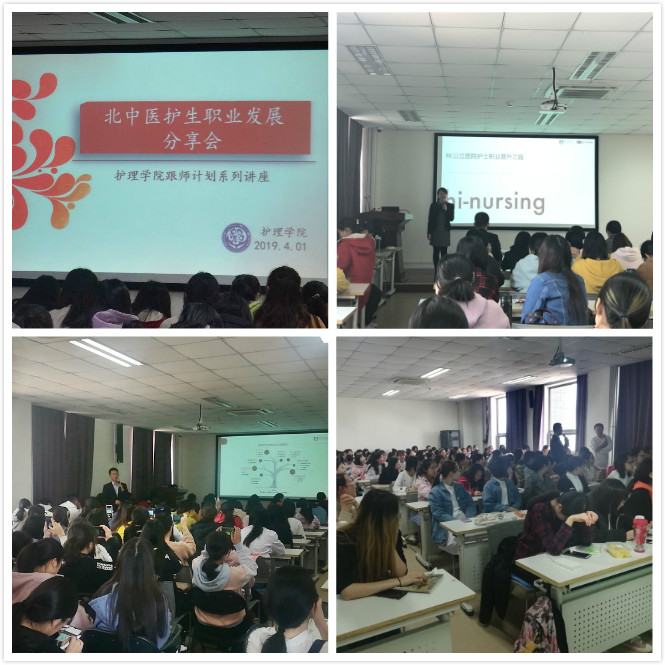 4 月 1 日、2 日中午,36365线路检测登录入口共计230余名本科学生在护理楼205举办“2019年跟师计划系列讲座第二场——护理职业发展分享交流会”,由我校创新创业基地嘉高喜和健康科技有限公司项目总监李建飞、白杨老师,给热切关注相关问题的36365线路检测登录入口学生分享护理职业发展之路,反响热烈。
