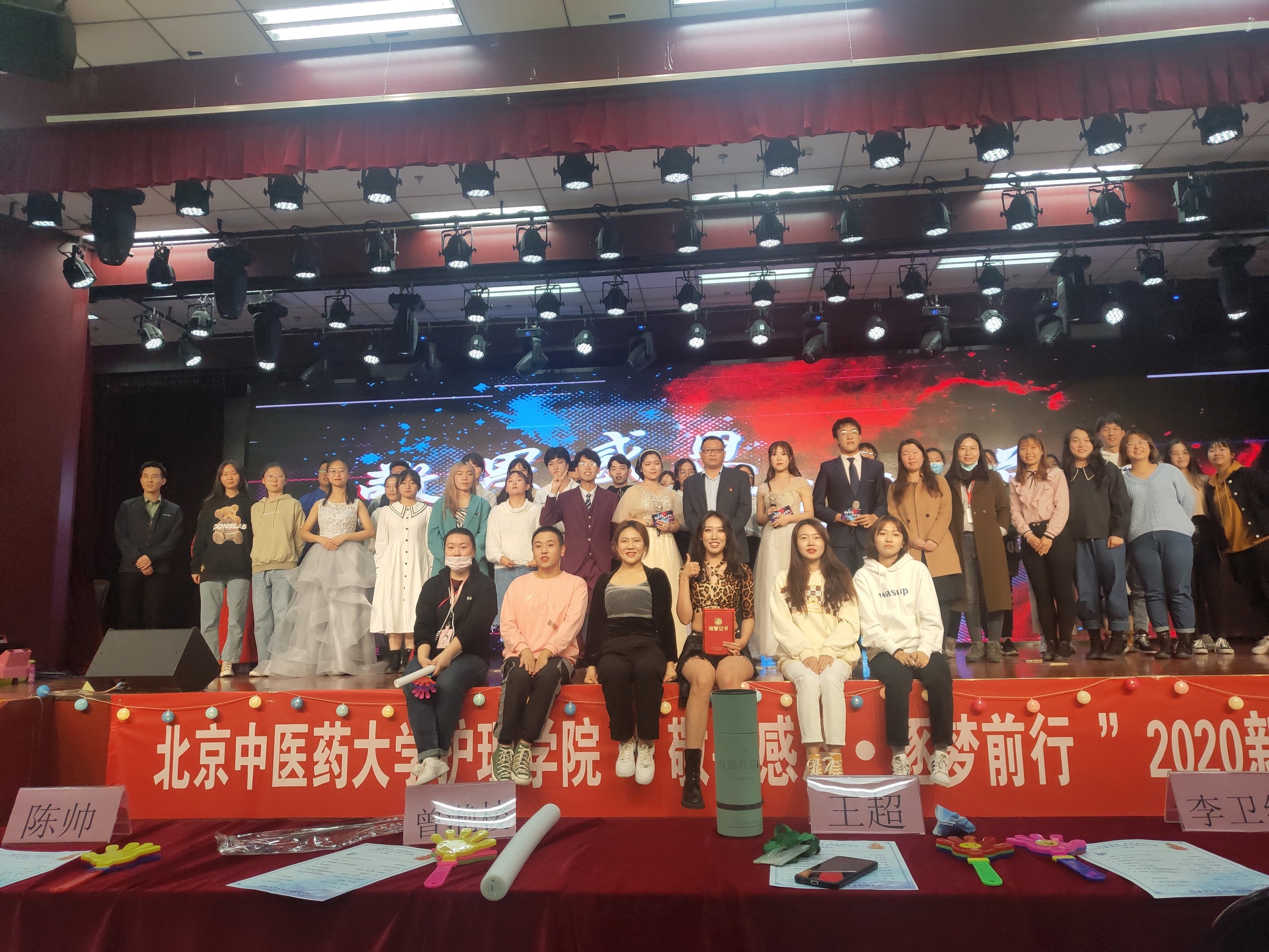 TK舞社带来的《boy with fake love》首先点燃了同学们的热情,随后歌伴舞《天天》、钢琴独奏《love story》、吉他弹唱《雨夜曼彻斯特》、独唱《陷阱》、歌曲串烧等节目为现场观众们带来一场美妙的视听盛宴;中医学院和中药学院两位同学带来的相声《打灯谜》更是逗得观众们捧腹大笑;朗诵《风雨挡不住春天》带领同学们再一次重温疫情下,中华儿女众志成城、共抗时艰的不屈斗志;最后《舞蹈串烧》和街舞《U2》引爆了同学们的热情,掌声经久不息。经过现场评委的评选,最终《舞蹈串烧》斩获桂冠,街舞《boy with fake love》和独唱《陷阱》、朗诵《风雨挡不住春天》夺得二三等奖。评委及嘉宾为获奖班级颁奖,并合影留念。