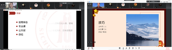 首先,孙雪敏老师向几位主讲同学的到来表示感谢,并着重强调了经验在考研过程中的重要意义,提醒参会的同学们应该及早准备,把握此次机会,积极提问。随后三位同学分别就自己所考的学校与专业等方面进行分享。王成龙告诉同学们要做好考研期间的心理准备,分享了一些实用的记忆技巧,希望同学们能牢记考研初心,坚持到最后。接着四川大学的蒋茜茜同学从前期准备、公共课复习、专业课复习三个角度给同学们的备考计划提供了详尽的建议,希望同学们能够把握好网络上的公共课资源,广泛搜集专业课资料,以稳固的基础完成考研。