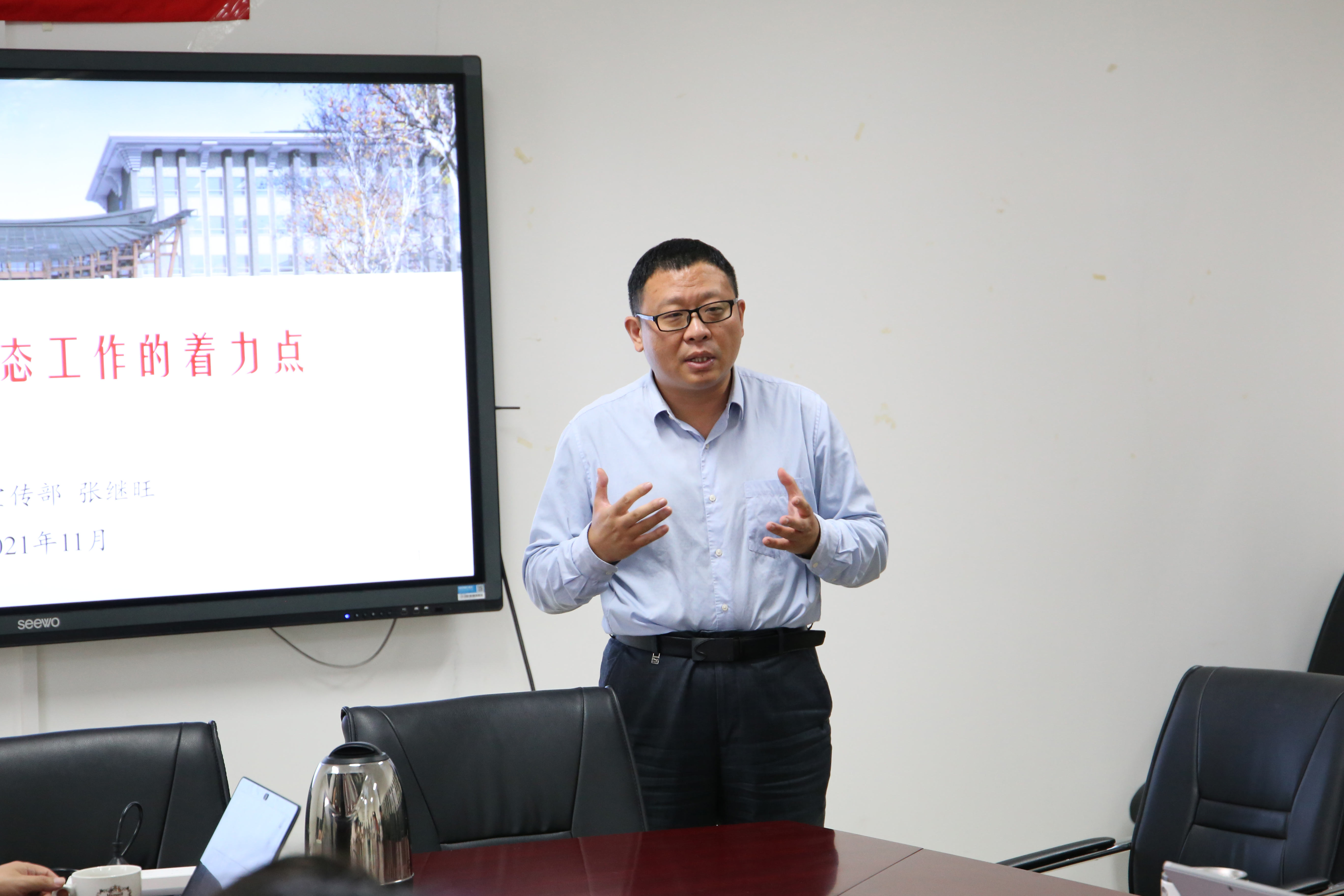 为深入学习贯彻习近平总书记关于意识形态工作的重要论述,进一步提升学院教师队伍意识形态工作能力,11月2日下午,36365线路检测登录入口邀请校党委常委、宣传部部长张继旺作了题为《高校意识形态工作的着力点》的专题讲座。讲座由学院党总支书记王超主持,学院领导班子、教研室主任、支部书记、支部委员、辅导员和班主任参加。