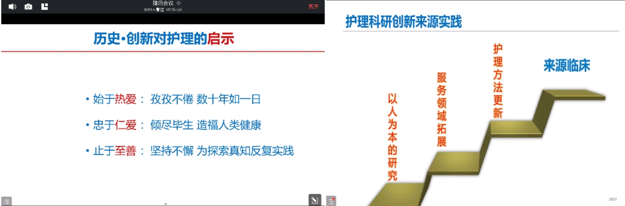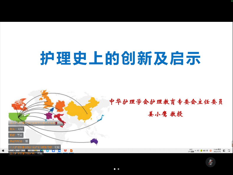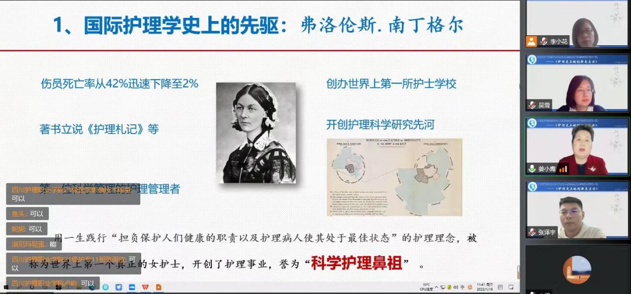 会议伊始,吴雪主委简单回顾了2020年的主要工作,并对支持和帮助委员会发展的各级领导和全体委员的共同努力表达了谢意。随后李小花主委简单介绍了2022年工作计划,并引出此次讲座的主讲人姜小鹰教授和讲座的主题“护理史上的创新与启示”。姜小鹰教授对学生工作委员会筹办职业发展公益讲堂给予充分的肯定和赞扬,并从三个方面开展本次讲授。首先姜教授介绍了中外护理发展史上的杰出领袖,如护理事业的开创者、“科学护理鼻祖”南丁格尔女士,从战争救护经验中学习并不断钻研和创新,提高了护理质量,并创造出“玫瑰图”,是护理研究的开端。姜教授还枚举了麦克奇尼、信宝珠、钟茂芳、黎秀芳等诸多护理前辈的科研成果和创新经验,指出历史创新中给予我们的启示——始于热爱,忠于仁爱,止于至善。同时呼吁广大护理学子应有所作为,接过护理前辈手中的提灯,继续一路前行。