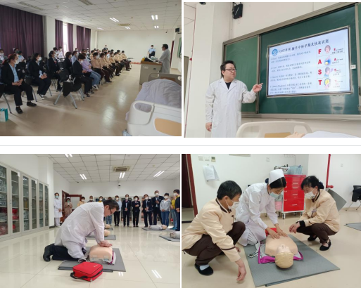 活动伊始,王惠峰老师就低血糖、咬伤、脱水及食物中毒等12种常见问题对学员们进行介绍,详细说明应如何预防上述问题及突发情况的急救措施;随后,王老师在护理楼一层急救技能训练室为学员们讲解何时进行心肺复苏,如何心肺复苏以及心肺复苏的结果,并介绍了在危急情况下AED除颤仪的使用方法。接下来,40名学员分为两组,在助教的协助下进行急救以及AED除颤仪的使用练习。最后学员们就实操过程中遇到的问题、急救技能掌握和急救知识理解与主讲老师和助教进一步交流。至此本次活动圆满结束。
