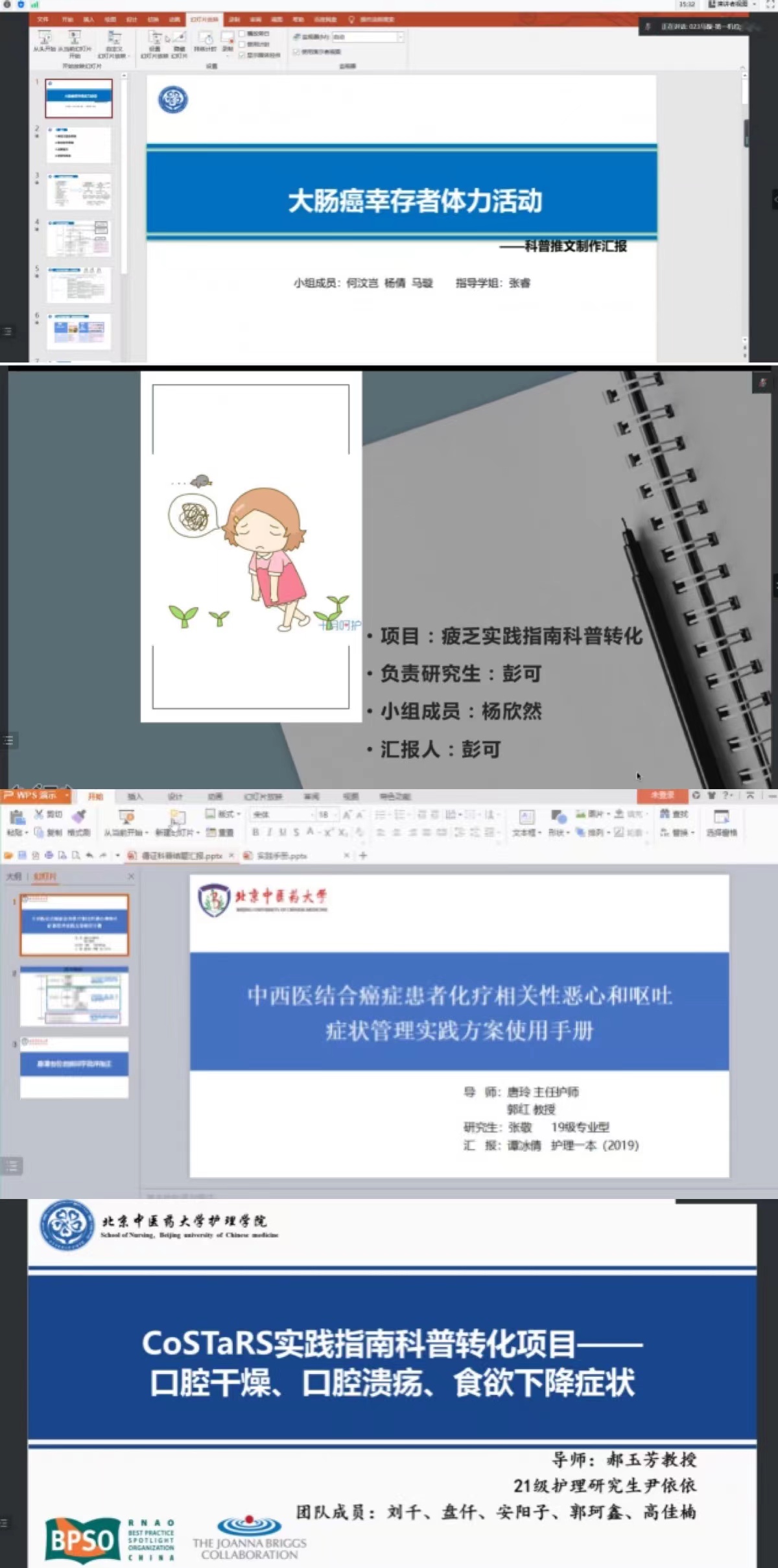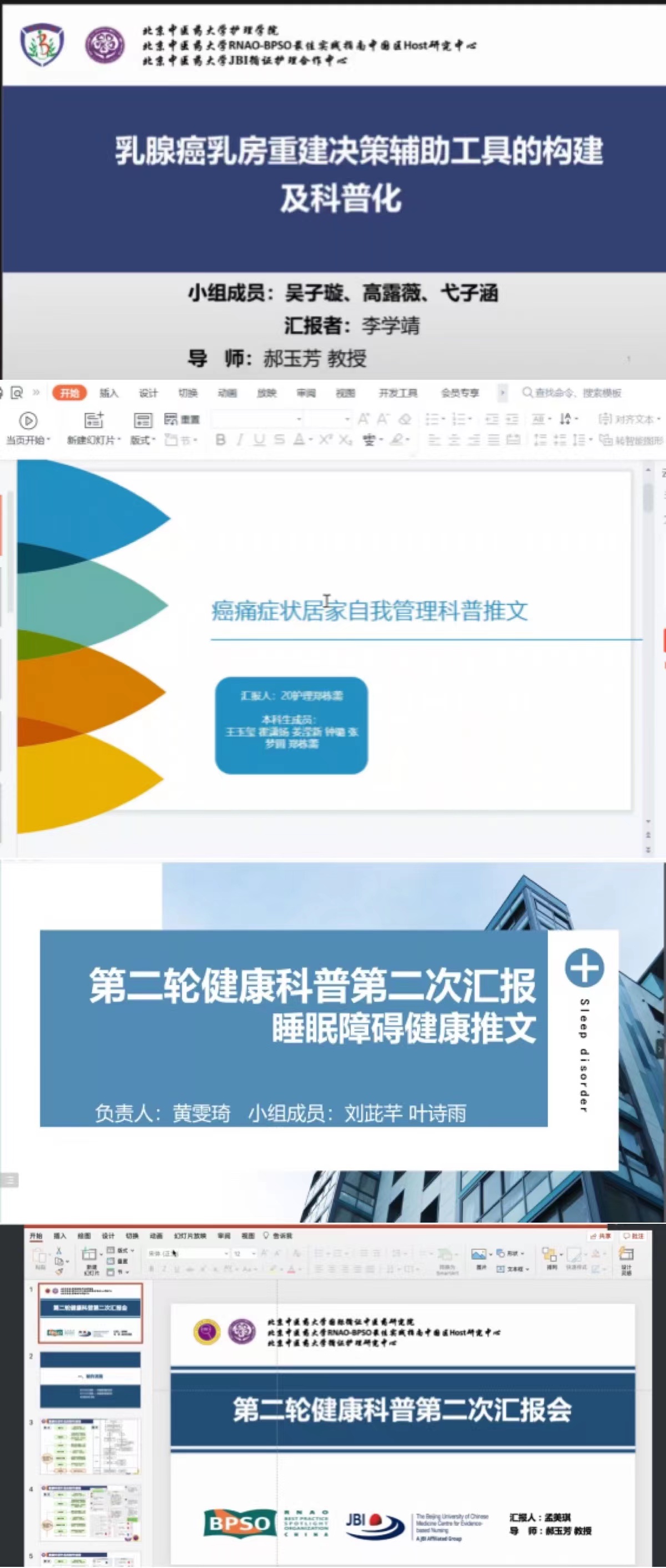 首先,主持人对本次健康科普交流会进行了简要的介绍。随后,由9名循证实践项目的研究生和本科生代表分别对所负责科普转化项目情况进行汇报。汇报的科普转化循证实践项目包括“乳腺癌乳房重建患者决策辅助工具包的构建研究”、“脑卒中肢体功能障碍康复护理患者指南的构建研究”、“大肠癌患者中西医结合运动康复方案的制定”、“针刺伤防护临床实践指南”以及10项肿瘤症状远程管理项目。汇报的内容包括健康科普项目实施的流程、项目成果展示以及研究生与本科生在研制健康科普后的感悟与心得体会。