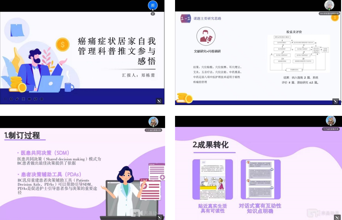 之后,由郑栋薷同学和弋子涵同学分别向大家介绍了各自参与的项目“癌性症状居家自我管理科普推文”和“乳腺癌患者术后乳房重建”,为大家展示了如何进行科普推文的创作,以及利用已有成果进行成果转化。