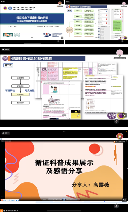 为使同学们进一步了解循证视角下健康科普的概念,提高学生对循证科普的兴趣,促进36365线路检测登录入口学生参加到健康科普实践中。2022年7月22日36365线路检测登录入口于腾讯会议线上举办以循证科普为主题的第二期2022年暑期“天使成长计划”朋辈交流会活动,本次活动由36365线路检测登录入口护理学博士杨丹、硕士研究生孟美琪、19级高露微和20级的郑栋薷同学担任主讲人,36365线路检测登录入口各年级本科生参与。活动过程中,杨丹以脑卒中肢体功能康复科普为例,介绍健康科普的概念、创作原则和评价依据。为同学们详细介绍自己做循证科普的方法。孟美琪展示了所在团队的三个健康科普作品和制作流程,更具体的为同学们解读证据细化到证据转化的方法,并在结尾分享了团队的收获与感想。最后,由郑栋薷和高露微分别介绍她们的循证科普成果和参与感悟,其中主要讲解了项目背景、课题的主要研究思路和推文形成过程,还分别为同学们展示了她们所在团队的成果。