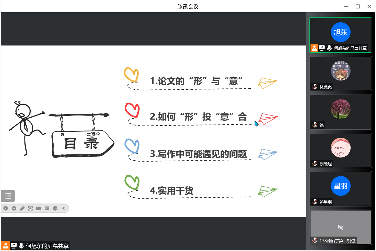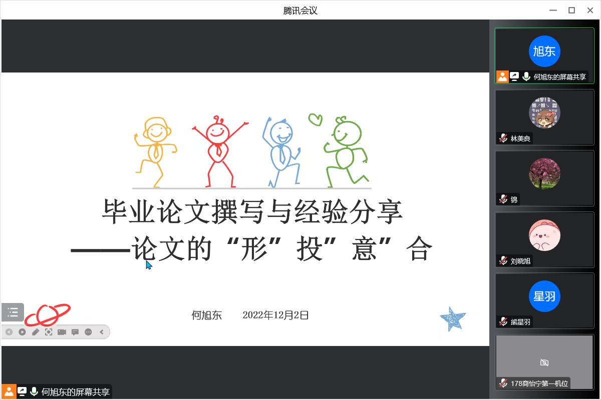 讲座中,何旭东同学讲述撰写毕业论文的基本要求,通过自身撰写本科毕业论文经历概括出论文的“形”投“意”合,,举例阐述“形”和“意”内涵以及两者之间关系。并就目前同学们科研能力和论文撰写面临困难,给出经验分享,建议同学们多读硕博士论文和权威期刊高质量论文,总结规律和挖掘套路,积累论文好言好句,多反思多交流。同时就论文的每一部分撰写时的注意事项以及论文查重率高等问题给出自己经验体会,最后分享文献数据库资源、推荐了文献管理软件,也鼓励同学们克服畏难情绪,立即行动起来,利用现在时间积极与导师沟通交流,顺利完成毕业论文这个培养环节。