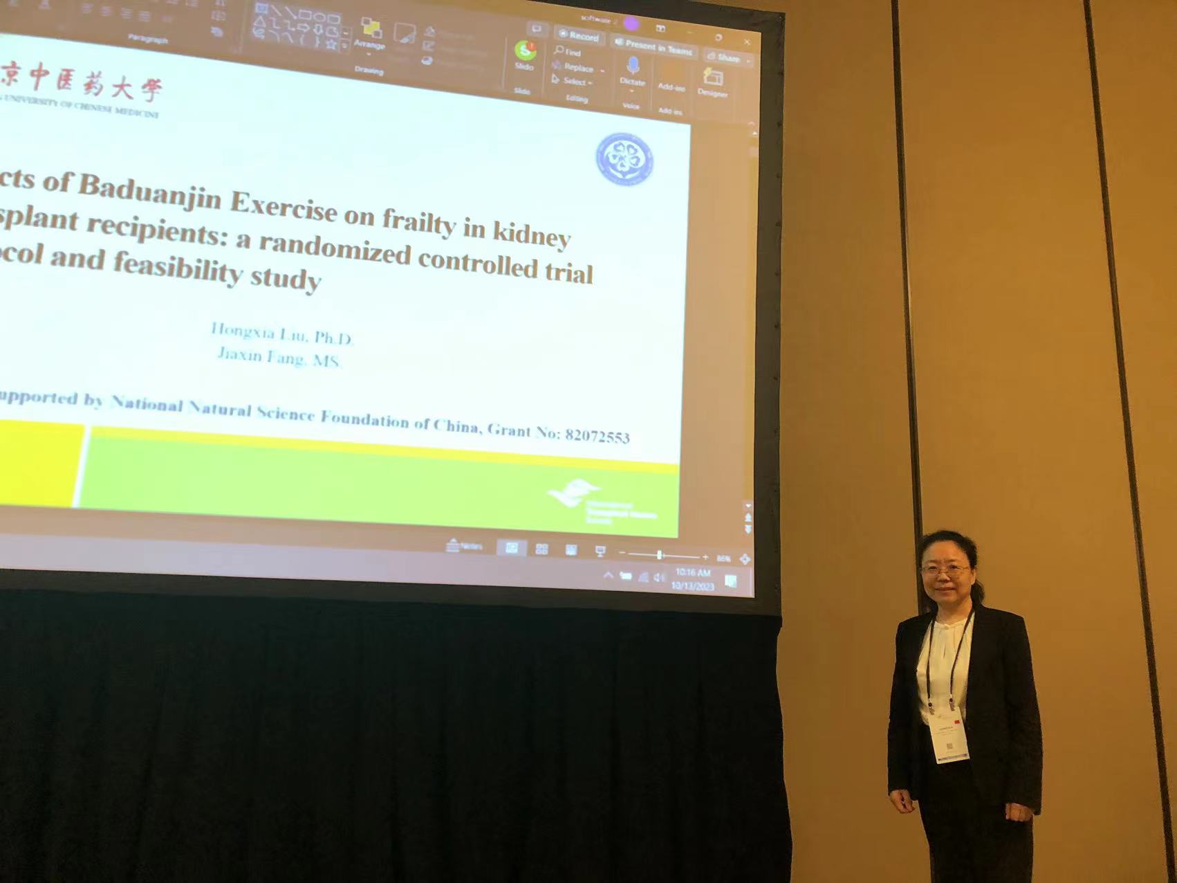 刘红霞教授进行了题为“Effects of Baduanjin Exercise on Frailty in Kidney Transplant Recipients: A Randomized Controlled Trial Protocol and Feasibility Study(八段锦运动对肾移植受者衰弱的影响:随机对照试验方案和可行性研究)”的主题报告,她期待通过中国传统功法——八段锦运动的干预,可以改善肾移植受者术后的衰弱情况,提高他们的生活质量,帮助他们进一步回归社会。
